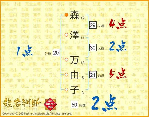 森(12画)澤(17画) 万(13画)由(5画)子(3画)