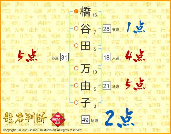 橋(16画)谷(7画)田(5画) 万(13画)由(5画)子(3画)