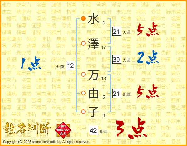 水(4画)澤(17画)  万(13画)由(5画)子(3画)