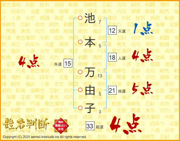 池(7画)本(5画) 万(13画)由(5画)子(3画)