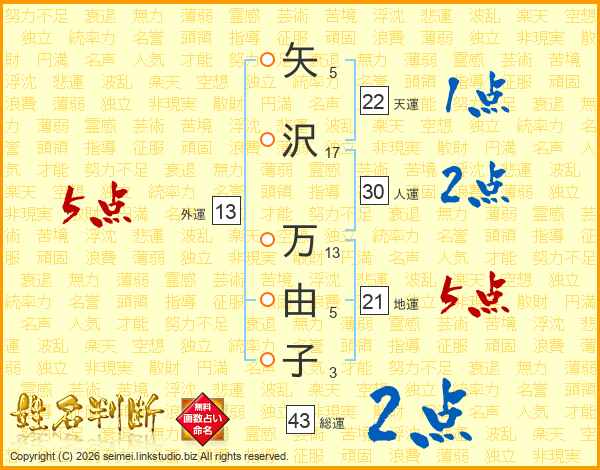 矢(5画)沢(17画) 万(13画)由(5画)子(3画)