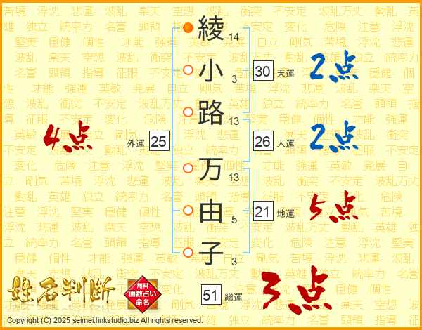 綾(14画)小(3画)路(13画) 万(13画)由(5画)子(3画)