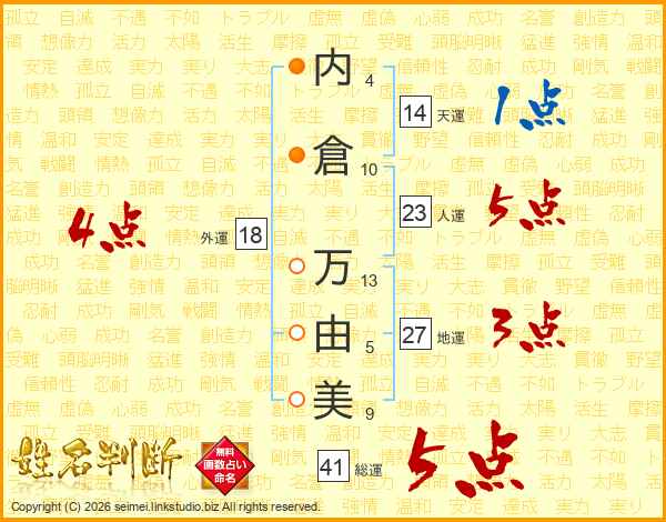 内(4画)倉(10画) 万(13画)由(5画)美(9画)