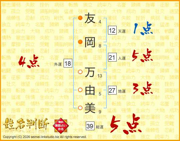 友(4画)岡(8画) 万(13画)由(5画)美(9画)