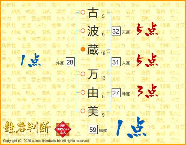 古(5画)波(9画)蔵(18画) 万(13画)由(5画)美(9画)