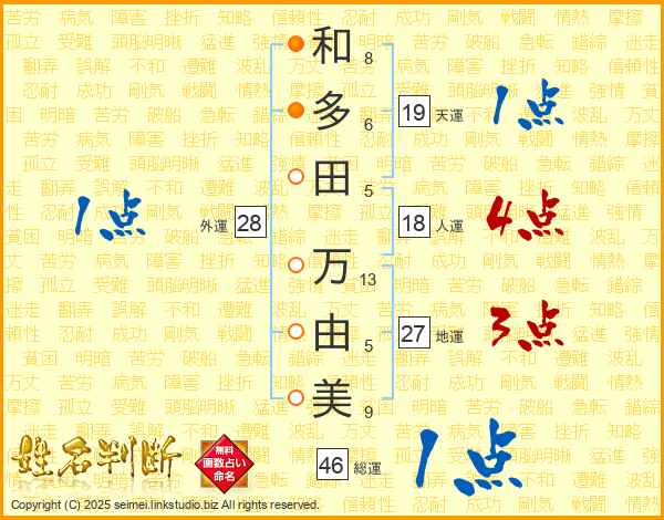 和(8画)多(6画)田(5画) 万(13画)由(5画)美(9画)