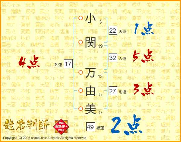 小(3画)関(19画) 万(13画)由(5画)美(9画)
