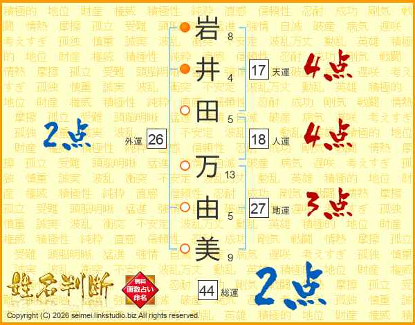 岩(8画)井(4画)田(5画) 万(13画)由(5画)美(9画)