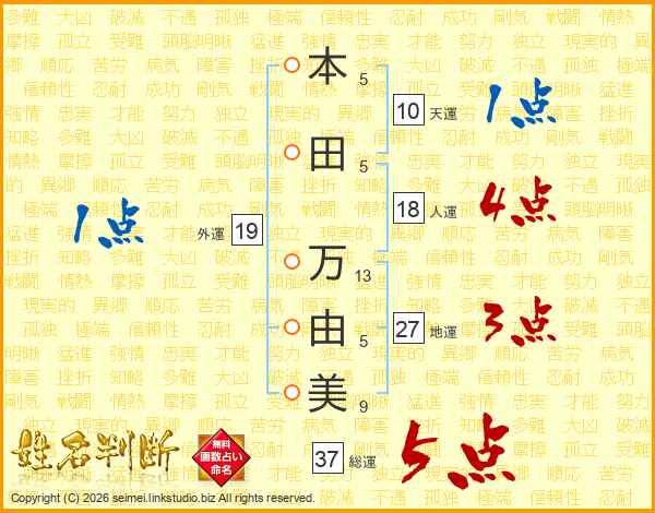 本田万由美さんの総運は37画の5点!
