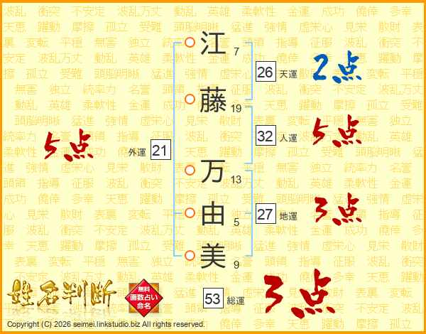 江(7画)藤(19画) 万(13画)由(5画)美(9画)