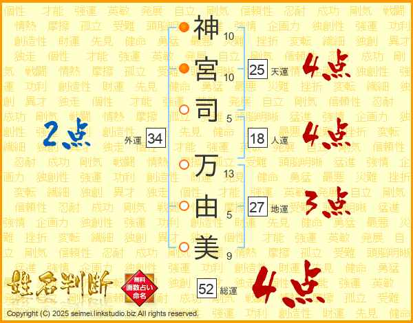 神(10画)宮(10画)司(5画) 万(13画)由(5画)美(9画)