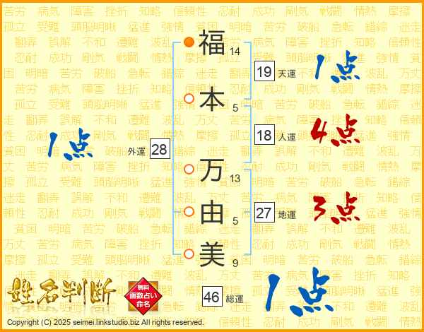 福(14画)本(5画) 万(13画)由(5画)美(9画)