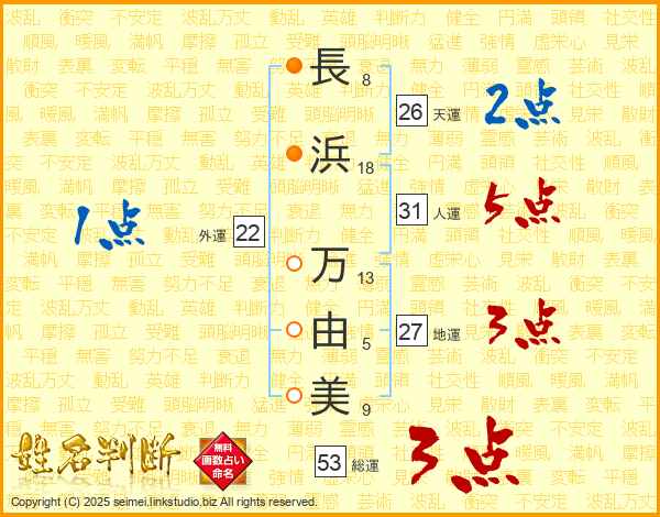 長(8画)浜(18画) 万(13画)由(5画)美(9画)