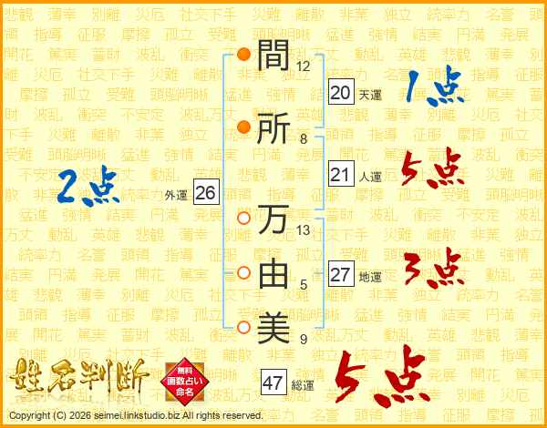 間(12画)所(8画) 万(13画)由(5画)美(9画)