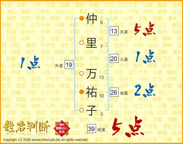 仲(6画)里(7画) 万(13画)祐(10画)子(3画)