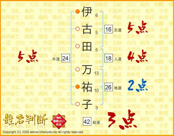 伊(6画)古(5画)田(5画) 万(13画)祐(10画)子(3画)