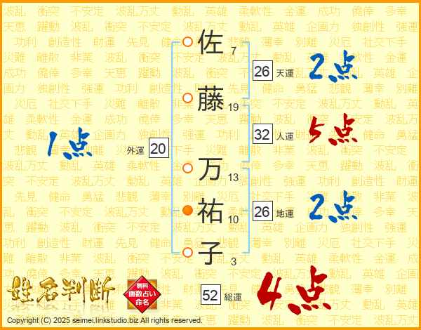 佐(7画)藤(19画) 万(13画)祐(10画)子(3画)
