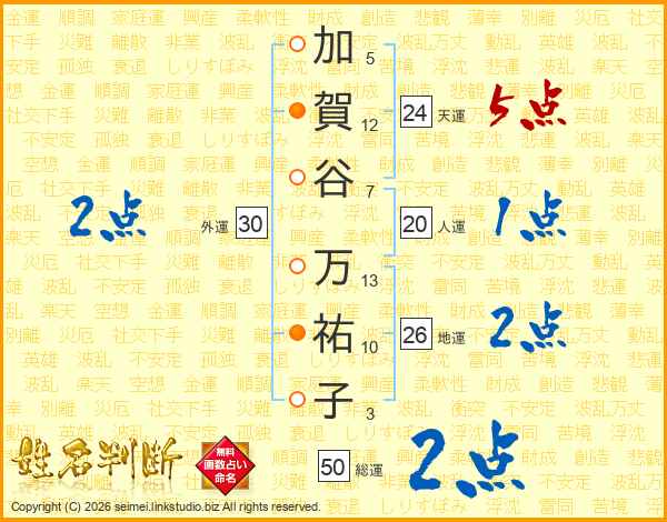 加(5画)賀(12画)谷(7画) 万(13画)祐(10画)子(3画)
