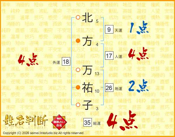 北(5画)方(4画) 万(13画)祐(10画)子(3画)