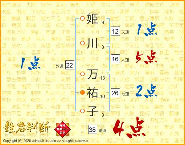 姫川万祐子さんの総運は38画の4点!