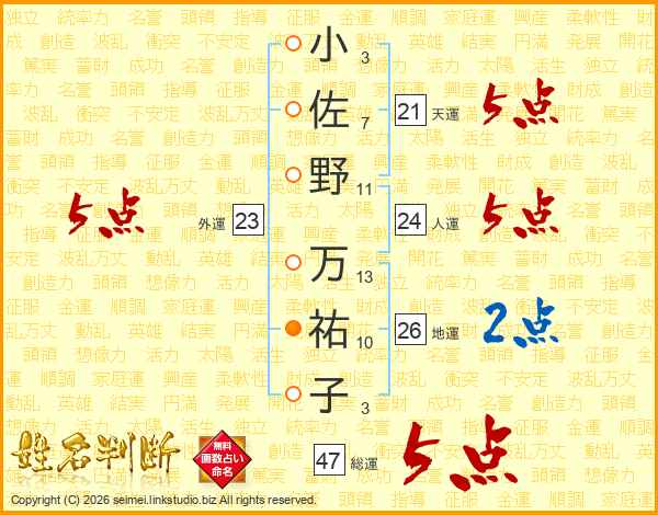 小(3画)佐(7画)野(11画) 万(13画)祐(10画)子(3画)