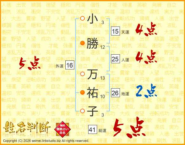 小(3画)勝(12画) 万(13画)祐(10画)子(3画)