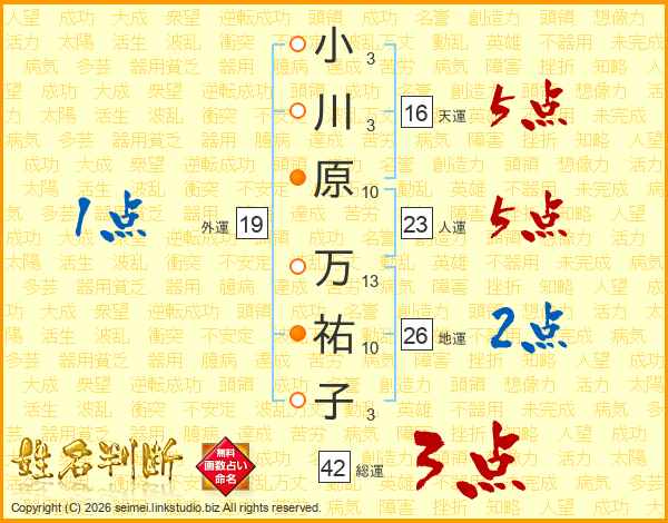 小川原万祐子さんの人運は23画の5点!