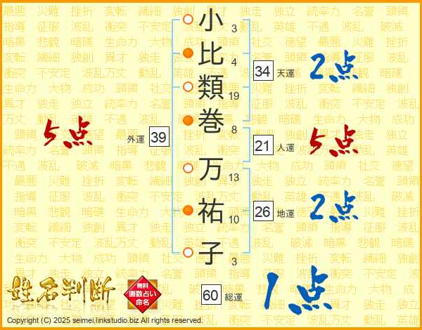 小(3画)比(4画)類(19画)巻(8画) 万(13画)祐(10画)子(3画)