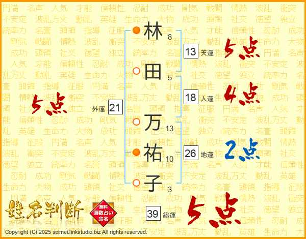 林(8画)田(5画) 万(13画)祐(10画)子(3画)