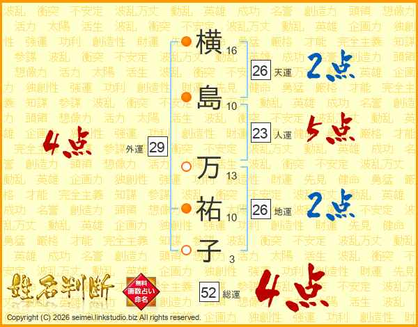横(16画)島(10画) 万(13画)祐(10画)子(3画)