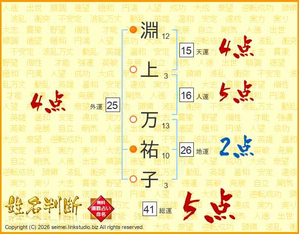 淵(12画)上(3画) 万(13画)祐(10画)子(3画)