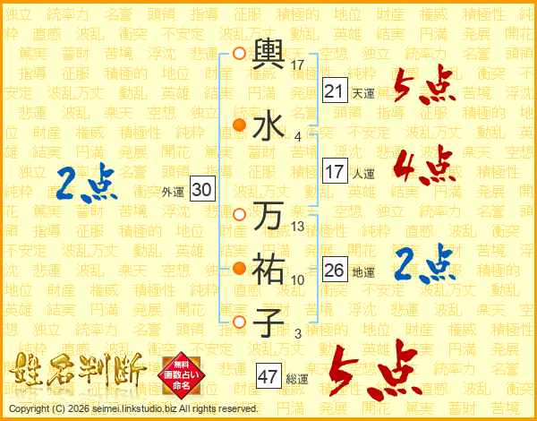輿(17画)水(4画) 万(13画)祐(10画)子(3画)