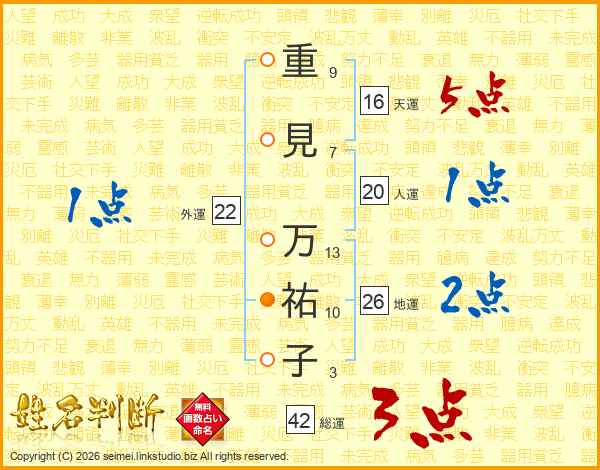 重(9画)見(7画) 万(13画)祐(10画)子(3画)