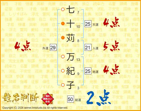 七(7画)十(10画)苅(8画) 万(13画)紀(9画)子(3画)