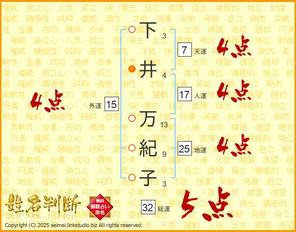 下(3画)井(4画) 万(13画)紀(9画)子(3画)