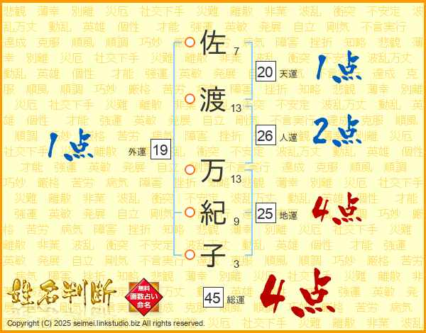 佐(7画)渡(13画) 万(13画)紀(9画)子(3画)