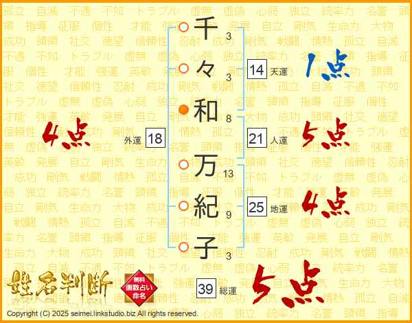 千(3画)々(3画)和(8画) 万(13画)紀(9画)子(3画)