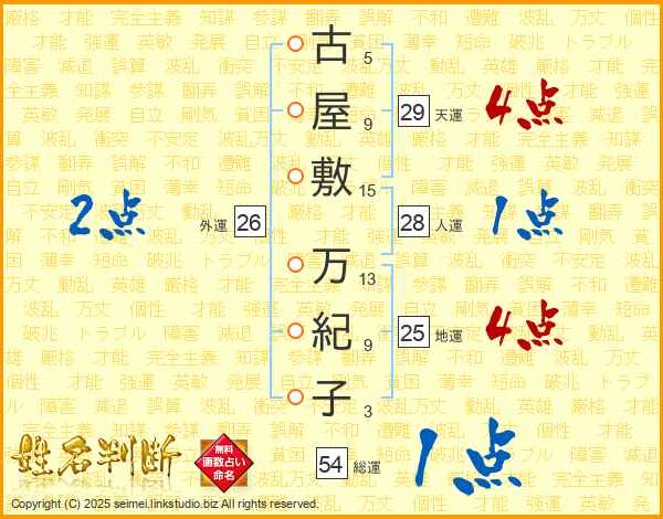 古(5画)屋(9画)敷(15画) 万(13画)紀(9画)子(3画)