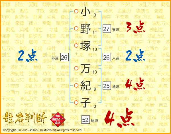 小(3画)野(11画)塚(13画) 万(13画)紀(9画)子(3画)