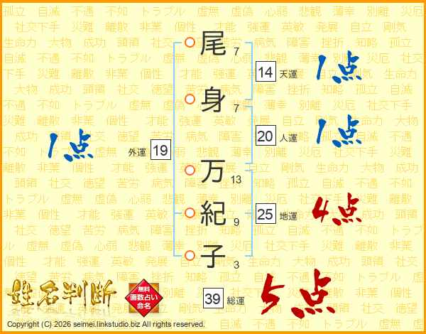 尾身万紀子さんの総運は39画の5点!