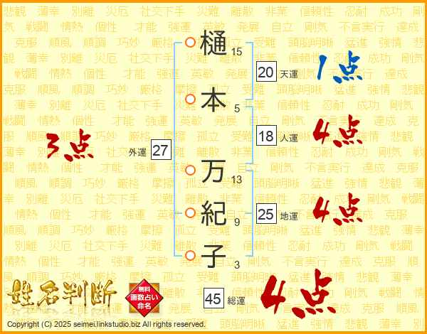 樋(15画)本(5画) 万(13画)紀(9画)子(3画)