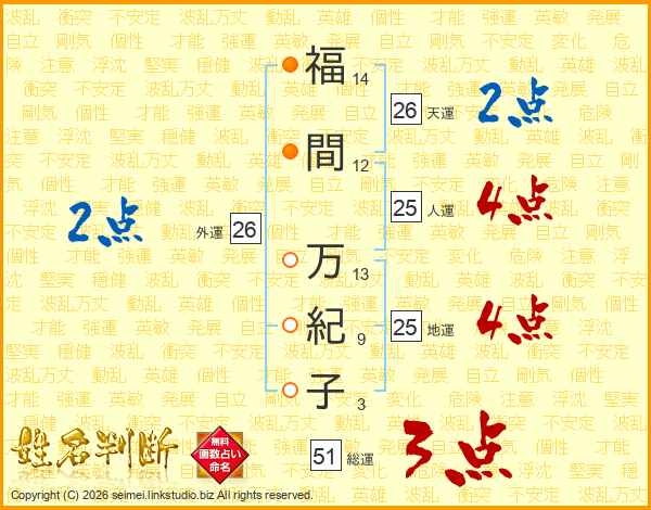 福(14画)間(12画) 万(13画)紀(9画)子(3画)