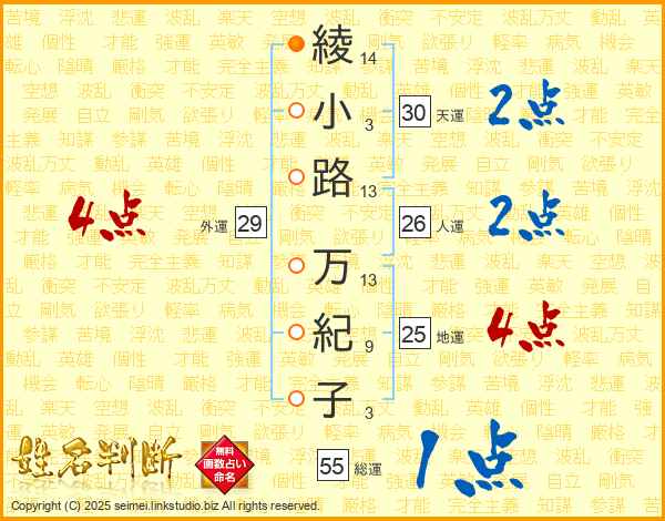 綾(14画)小(3画)路(13画) 万(13画)紀(9画)子(3画)