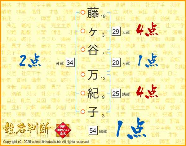 藤(19画)ヶ(3画)谷(7画) 万(13画)紀(9画)子(3画)