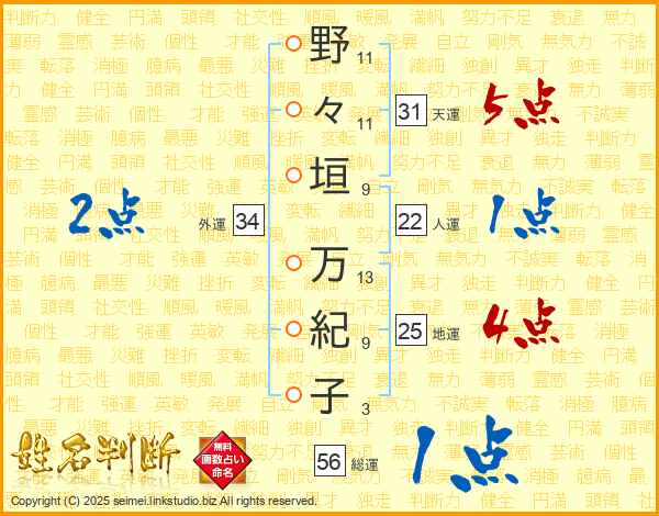 野(11画)々(11画)垣(9画) 万(13画)紀(9画)子(3画)
