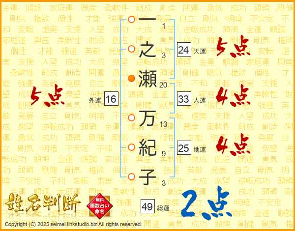 一(1画)之(3画)瀬(20画) 万(13画)紀(9画)子(3画)