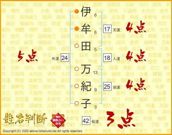 伊(6画)牟(6画)田(5画) 万(13画)紀(9画)子(3画)