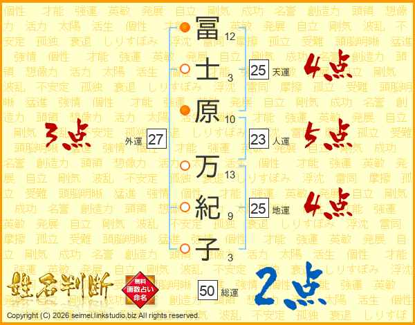 冨(12画)士(3画)原(10画) 万(13画)紀(9画)子(3画)