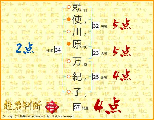 勅(11画)使(8画)川(3画)原(10画) 万(13画)紀(9画)子(3画)