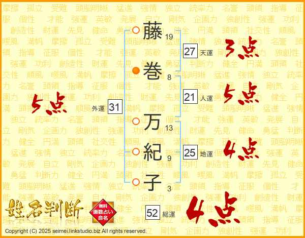 藤(19画)巻(8画) 万(13画)紀(9画)子(3画)